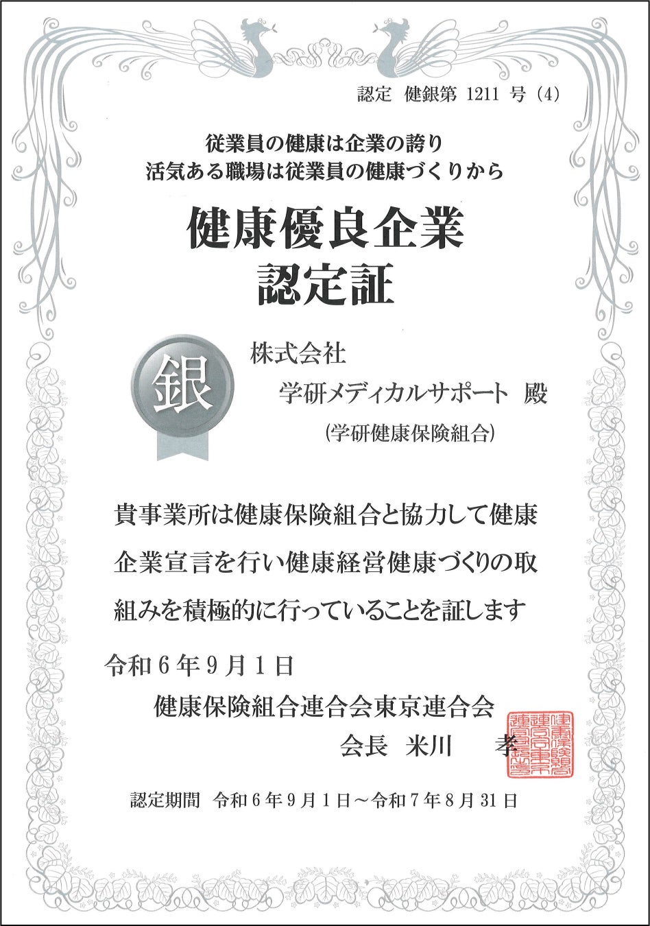 株式会社 学研ホールディングス(東京・品川/代表取締役社長:宮原博昭)のグループ会社、株式会社 学研メディカルサポート(東京・品川/代表取締役社長:清水修)は、健康保険組合連合会東京連合会に「健康企業宣言※」を行い、健康経営に向けた職場の健康づくりや、環境整備などの積極的な取り組みが評価され、2024年9月1日(日)付で健康優良企業「銀の認定」(健銀第1211号(4))を取得いたしました。