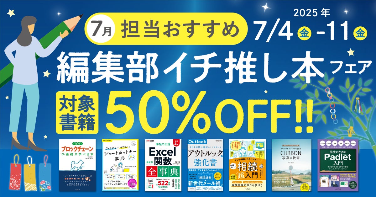 インプレスグループでIT関連メディア事業を展開する株式会社インプレス(本社:東京都千代田区、代表取締役社長:高橋隆志)は、対象の電子書籍が50%オフで購入できる「担当おすすめ!編集部イチ推し本フェア 2025年7月」を2025年7月4日(金)から7月11日(金)まで実施いたします。