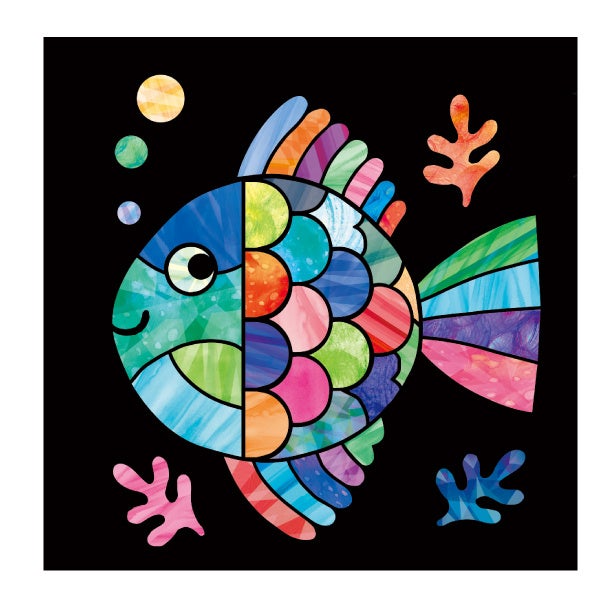 大好評につき、発売後たちまち大重版決定。真っ黒な背景にカラフルなシールをはって、美しいイラストを完成させる新感覚シールパズルです。