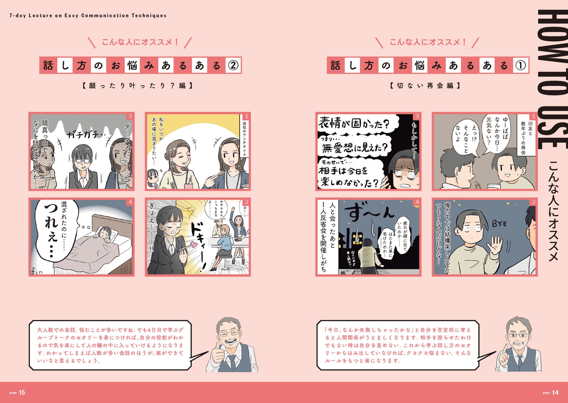 7日間(全7章)にわたる内容で、日常の会話からビジネスシーン、恋愛まで、あらゆる場面に対応。初対面から2度目の会話、1対1のやり取り、グループトーク、ビジネスや恋愛など、誰もが抱える「話し方のリアルな悩み」にしっかり寄り添いながら、解決方法をアドバイスします。