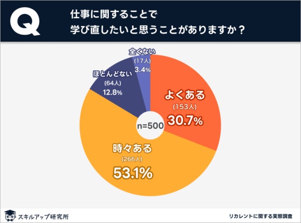 リカレントの経験率の低さの一方で、「仕事に関することで学び直したいと思うことがありますか?」という質問に対しては、計8割以上が「よくある」「時々ある」と回答した。