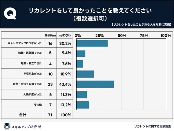 また「キャリアアップにつながった」という回答も30.2%で多く、リカレントはキャリアアップにもつながる可能性も高いと言える。