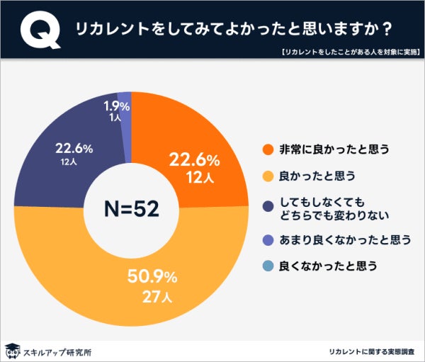 「リカレントをしてみてよかったと思いますか?」という質問に対し、リカレントをしたことがある人のうち、22.6%が「非常に良かったと思う」と回答し、50.9%が「良かったと思う」と回答した。