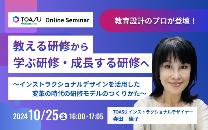 株式会社 学研ホールディングス(東京・品川/代表取締役社長:宮原博昭)のグループ会社、株式会社TOASU(東京・品川/代表取締役社長:宮田 晃)は、2024年10月25日(金)に、「教える研修から学ぶ研修・成長する研修へ~インストラクショナルデザインを活用した変革の時代の研修モデルのつくりかた~」を実施いたします。