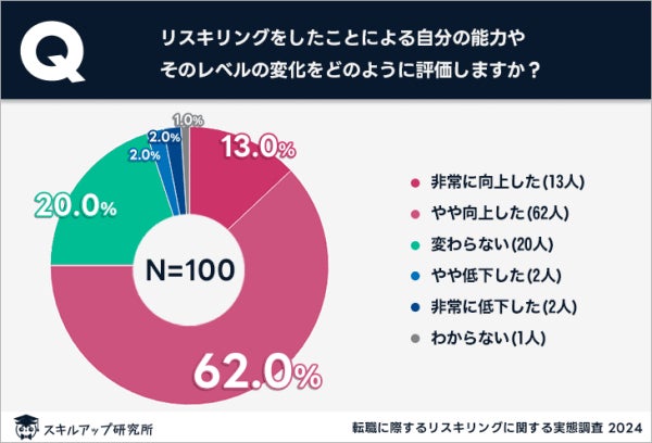 リスキリングをしたことによる自分の能力やそのレベルの変化をどのように評価するかについて尋ねたところ、75%の人が能力の向上を実感しており、リスキリングが個人のスキルアップに寄与していることが明らかとなった。