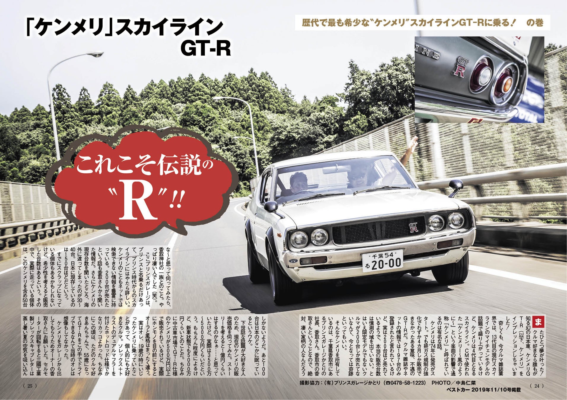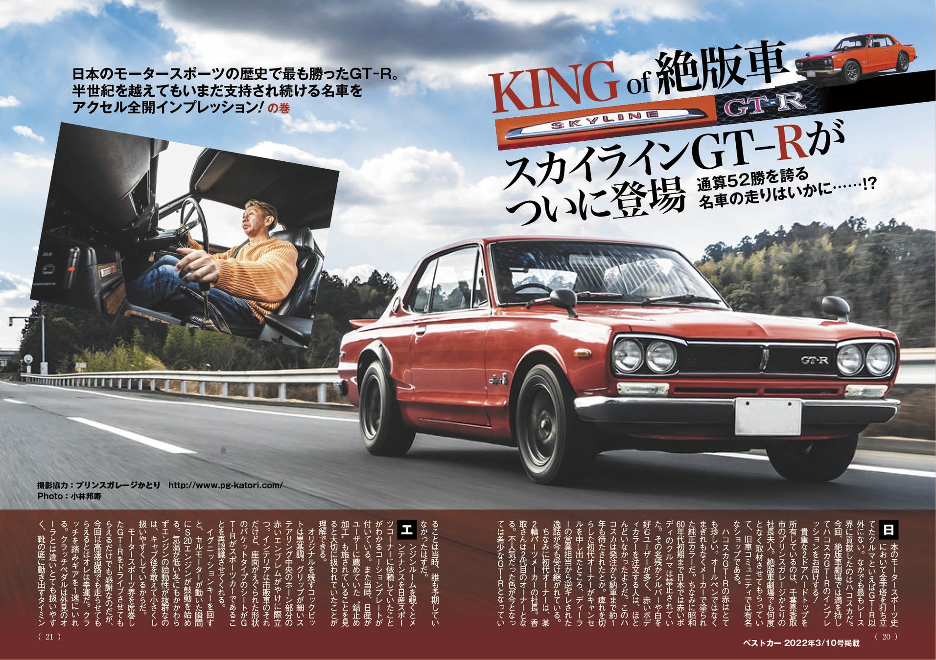 国産絶版モデルの王者ともいうべき初代スカイラインGT-R、通称ハコスカGT-Rも実際に試乗してインプレッション。アクセルを深く踏み込んだ際のエンジンの官能さは今なお健在なことに感動!