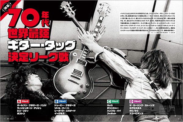 バンドに2人以上のギタリストが存在することを、ツイン(トリプル)・ギター、ツイン・リードなどと呼ぶ。同じ楽器を奏でるふたつの個性は時にハーモニーで交わり、時にバッキングとリードという形で補い合っていく。そこで生まれる「絆」に僕らは狂喜する。そう、彼らはプロレスで言うところの「タッグ」なのだ。今夏、本誌のリングには予選を勝ち抜いた16組のギター・タッグが集った。デュアン・オールマンとディッキー・ベッツのオールマン・ブラザーズ・バンド、エース・フレーリーとポール・スタンレーのKISS、キース・リチャーズとロニー・ウッドのザ・ローリング・ストーンズなど……。互いの持ち味を活かし、絶妙なコンビネーションで最強の栄冠をつかみ取るのは、いずれのタッグか。いざ、開幕!