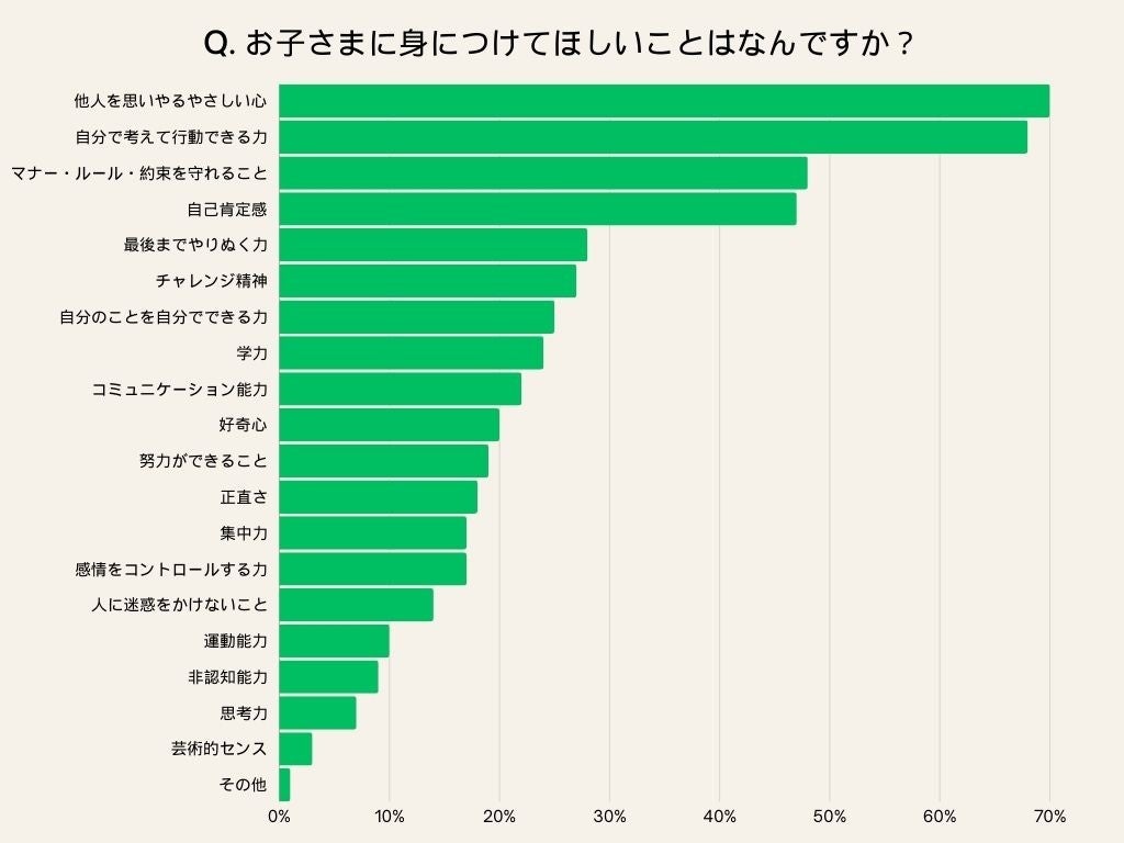 その結果、多くの保護者が「お子さまに身につけてほしいこと」として、「他人を思いやるやさしい心」「自分で考えて行動できる力」「マナー・ルール・約束を守れること」「自己肯定感」をあげていることがわかりました。