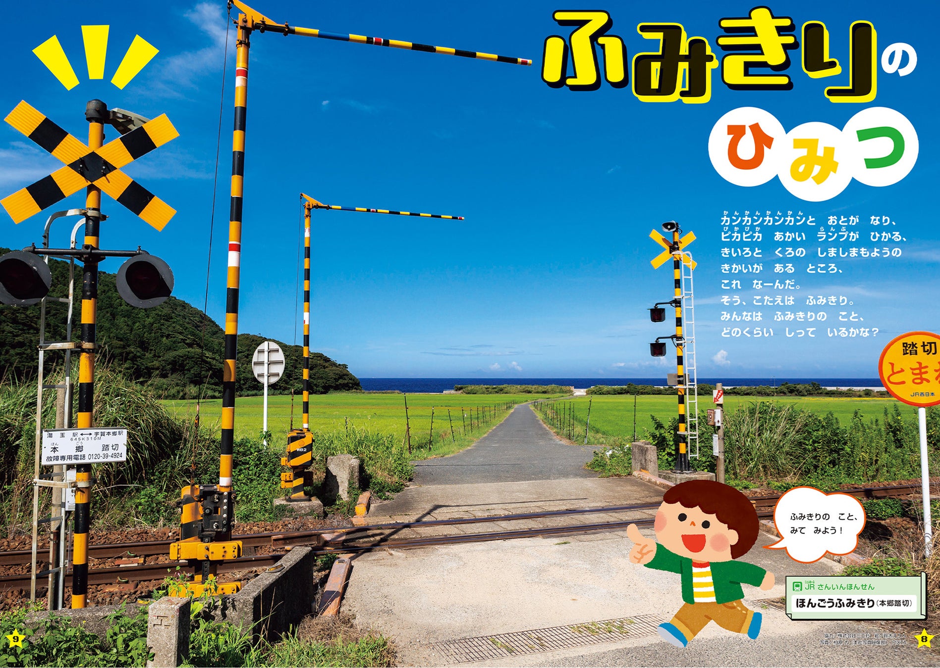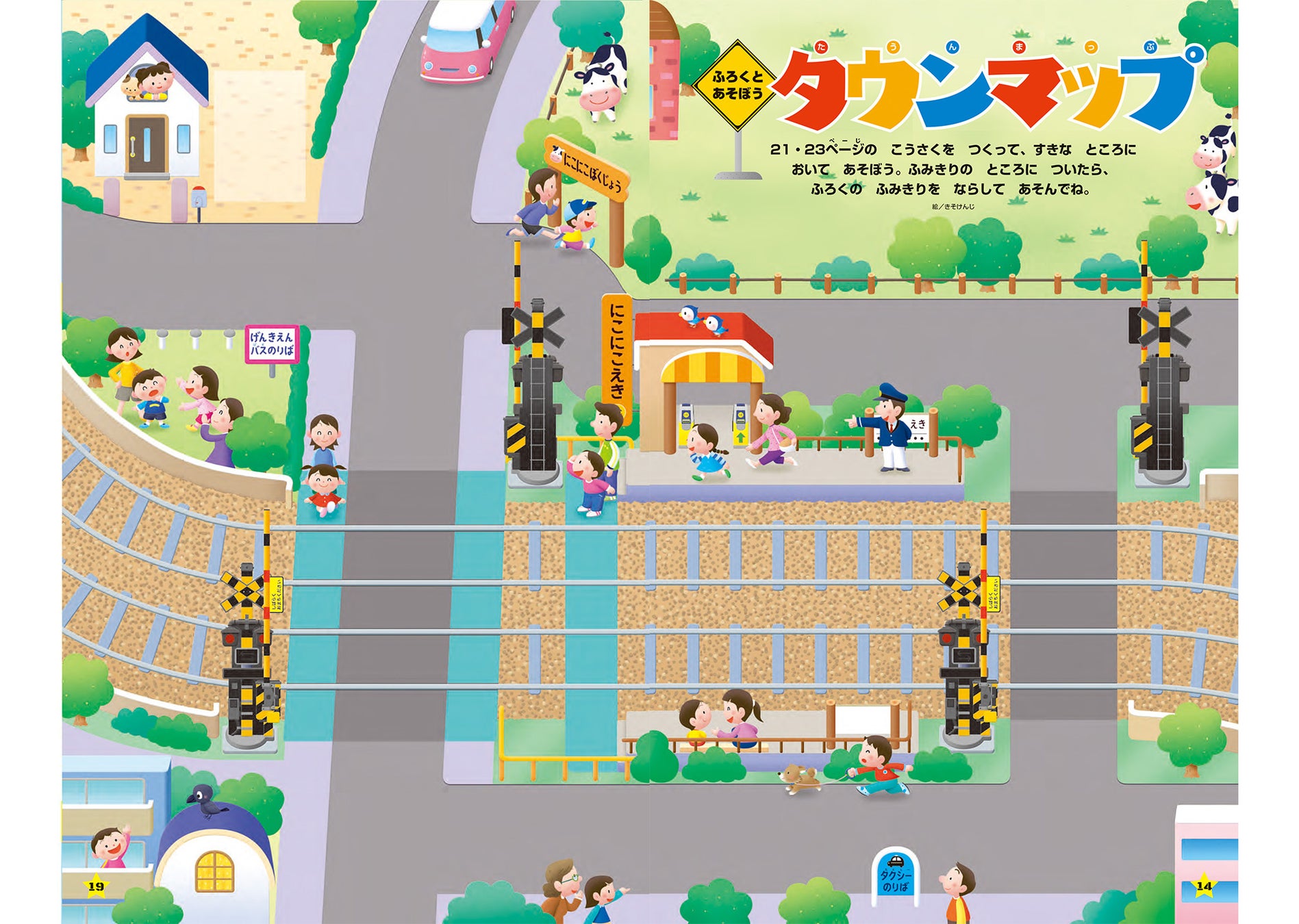 踏切の仕組みや作り方、さまざまな種類の踏切、踏切の渡り方やルールなど、楽しく学びながらたっぷり遊べる一冊です。