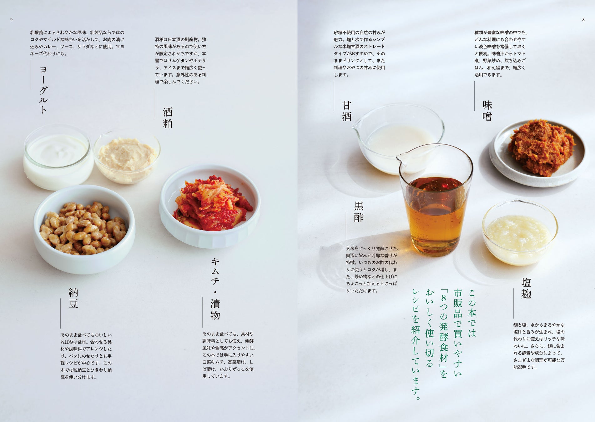 生活に取り入れやすい、市販の味噌、甘酒、塩麹、黒酢、酒粕、ヨーグルト、キムチ・漬物、納豆といった8つの発酵食材をピックアップ。それぞれの発酵食品ごとに、使い切るためのコツとレシピをまとめた一冊