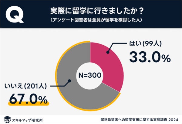 回答者(留学を検討したことがある人)全員を対象とした「実際に留学に行きましたか?」という質問に対し、67%が「いいえ」と回答した。留学を検討した人のうち、実際に留学に行ったのは3分の1に過ぎず、7割近くの人が留学に行くことを断念していることが判明した。