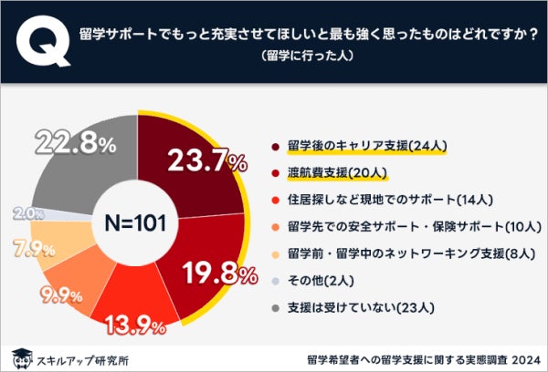 留学経験者を対象として、「留学サポートでもっと充実させてほしいと最も強く思ったものはどれですか?」と質問をしたところ、23.7%が「留学後のキャリア支援」と回答し最も多かった。