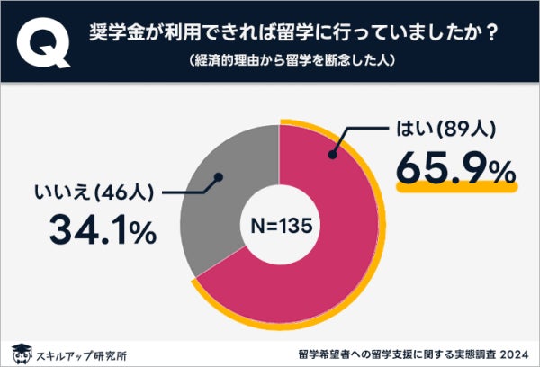 留学に行かなかった理由として「経済的に難しかったため」と回答した人を対象に、「奨学金が利用できれば留学に行っていましたか?」と質問をしたところ、65%が「はい」と回答した。