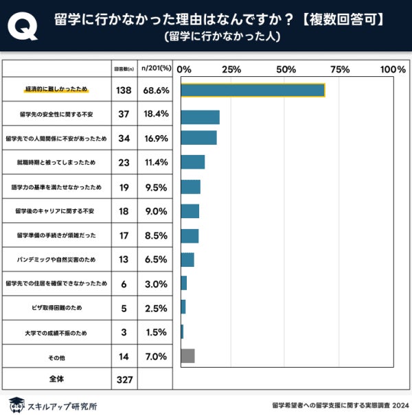 留学に行かなかった人を対象とした「留学に行かなかった理由はなんですか?(複数回答可)」という質問に対し、68%が「経済的に難しかったため」と回答し、最も多かった。