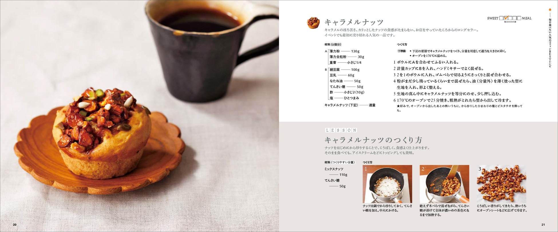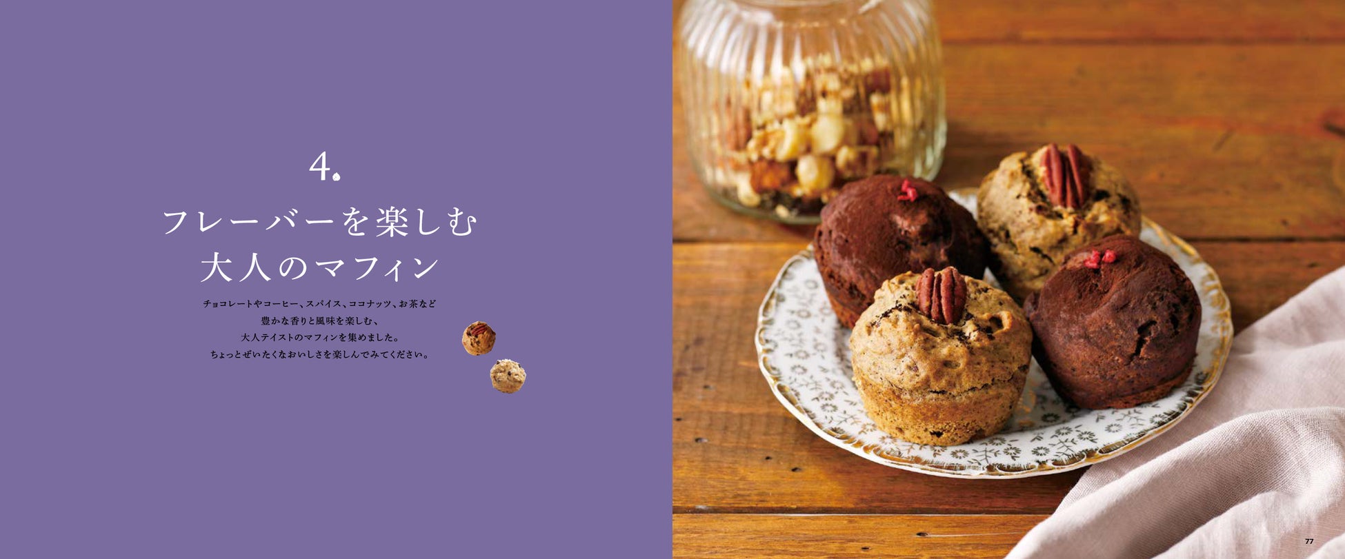 キャラメルナッツマフィン、レモンポピーシードマフィン、キャロブマロンマフィンなど、著者が主宰するマフィン教室や、イベントで人気のアイテムをはじめ、旬のフルーツや野菜を使ったもの、お茶などのフレーバーを楽しむもの、麹や和の素材を使ったものなど、オリジナリティあふれるレシピを選りすぐって紹介します。