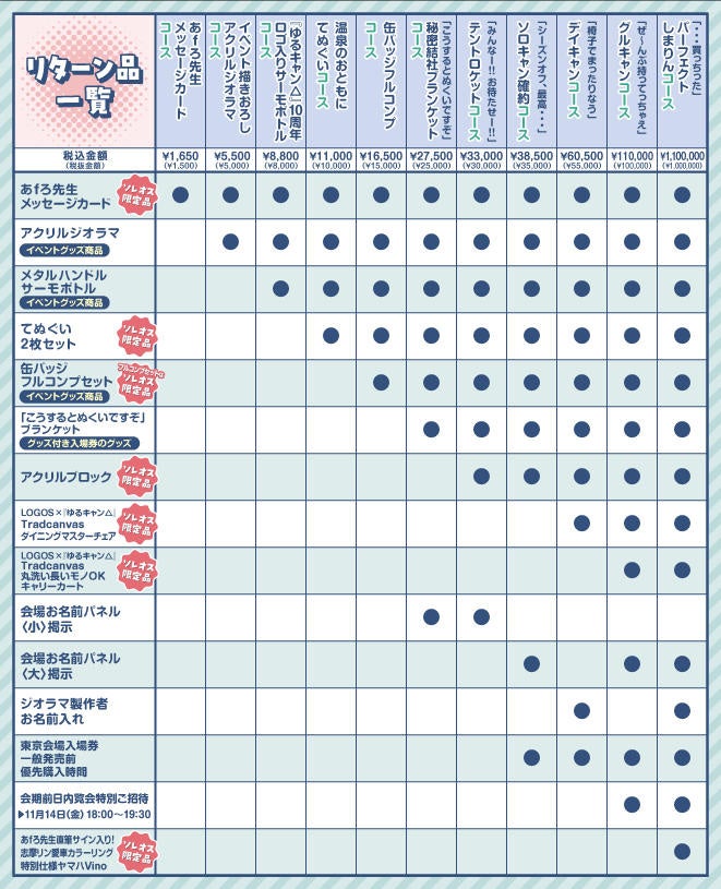■リターン品・コース一覧(★が付いている物はソレオス限定品)