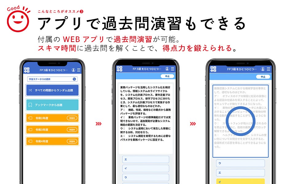 テキストで身につけた知識を定着させるためには、問題を解いてアウトプットすることが効果的! アプリを活用することで、通勤中や休み時間など、ちょっとしたスキマ時間に、サクサクと過去問対策を行えます。