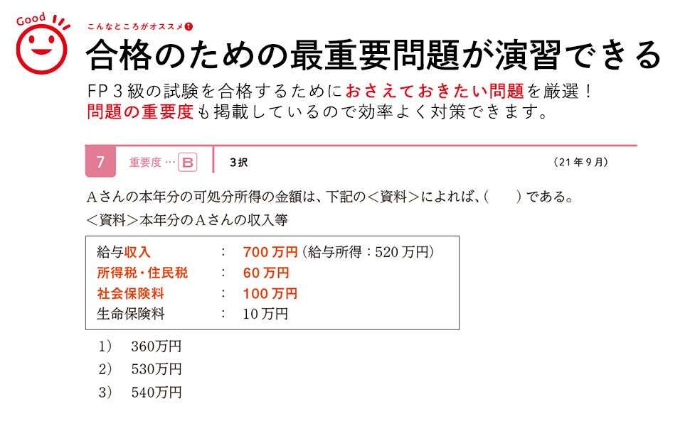 さらに、FP3級、2級それぞれの試験合格に向けて、おさえておきたい問題を厳選。問題の重要度も掲載しているので効率よく対策できます。