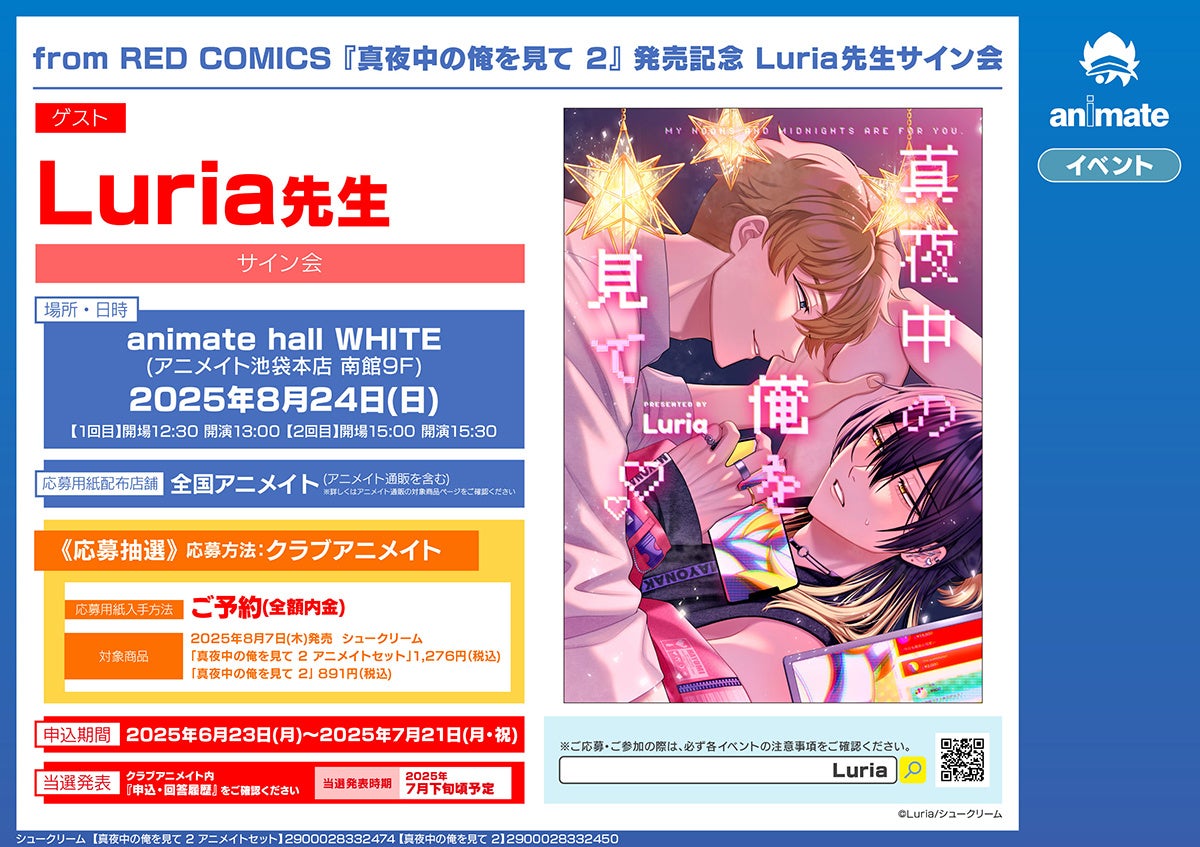 さらに、「from RED COMICS 『真夜中の俺を見て 2』 発売記念 Luria 先生サイン会」をanimate hall WHITE(アニメイト池袋本店 南館9F)にて8月24日に開催いたします。全国アニメイト・アニメイト通販にて『真夜中の俺を見て 2』(アニメイトセット含む)をご予約いただいた方の中から抽選で、サイン会にご招待いたします。Luria先生のサイン会は日本では初となりますので、ぜひお見逃しなく!