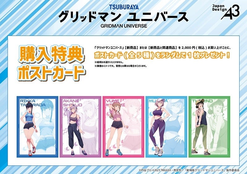 期間中に会場内にて「グリッドマンユニバース」新商品、または新商品と関連商品を2,000円(税込)お買い上げごとに、特典ポストカード(全5種)をランダムで1枚プレゼント!