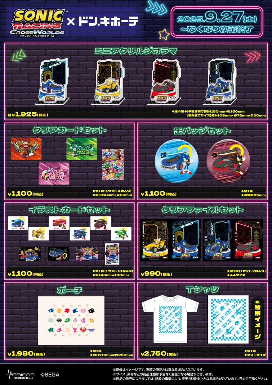 株式会社セガは、2025年9月25日(木)に発売予定のPlayStation®5、PlayStation®4、Xbox Series X|S、Xbox One、Nintendo Switch™、PC(Steam、Epic Games Store)用ソフト『ソニックレーシング クロスワールド』について、9月27日(土)よりドン・キホーテの対象店舗にてオリジナルグッズを発売することを決定したしました。