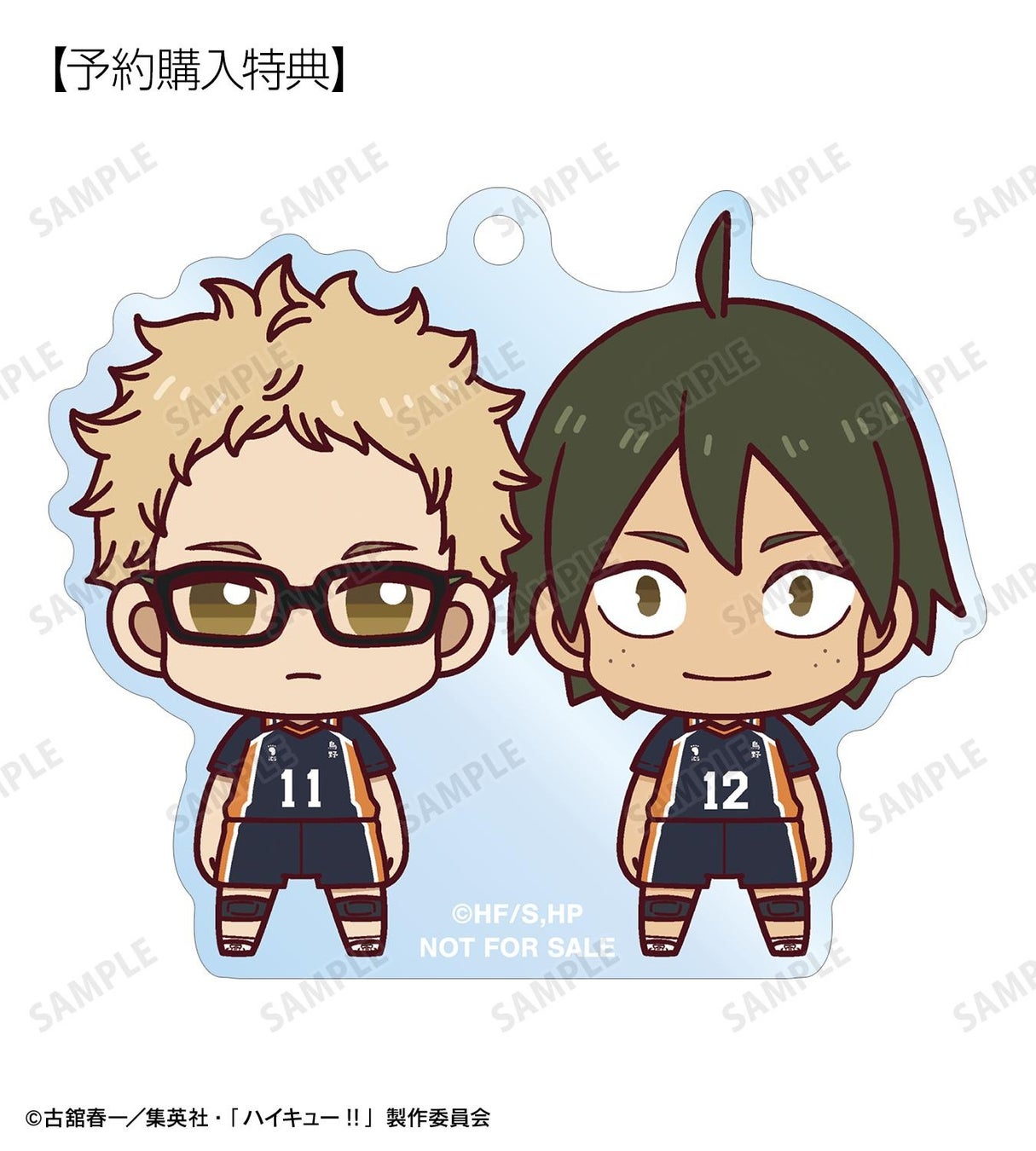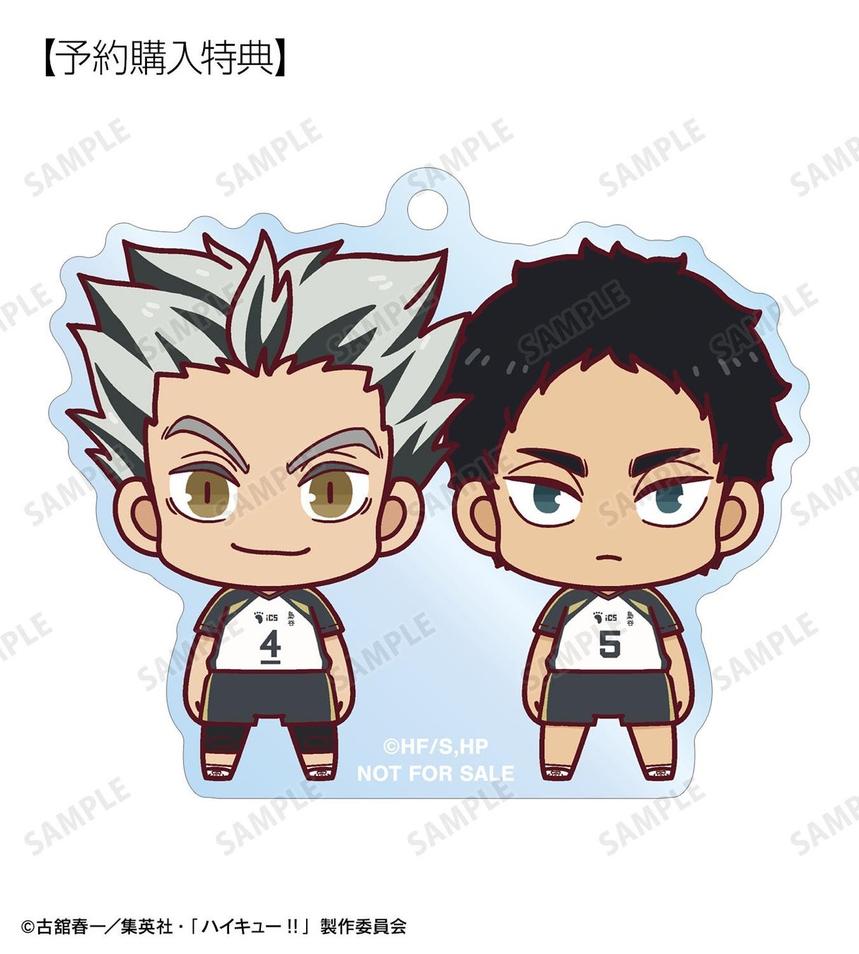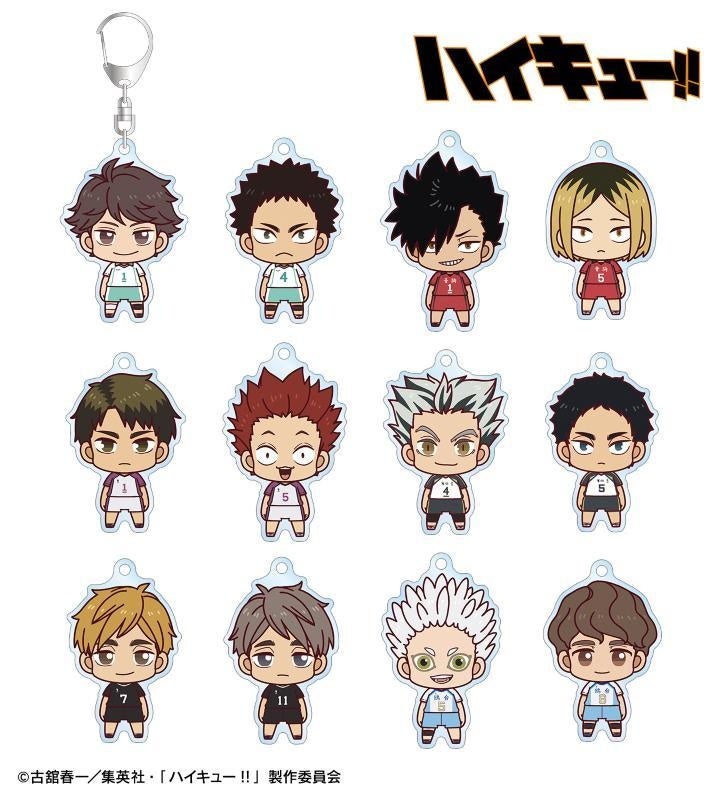 及川 徹、岩泉 一、黒尾鉄朗、孤爪研磨、牛島若利、天童 覚、木兎光太郎、赤葦京治、宮 侑、宮 治、星海光来、昼神幸郎がちょこんと立っているちびキャラを新たに描き起こし、アクリルキーホルダーに仕上げました。