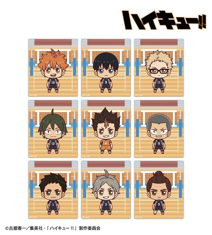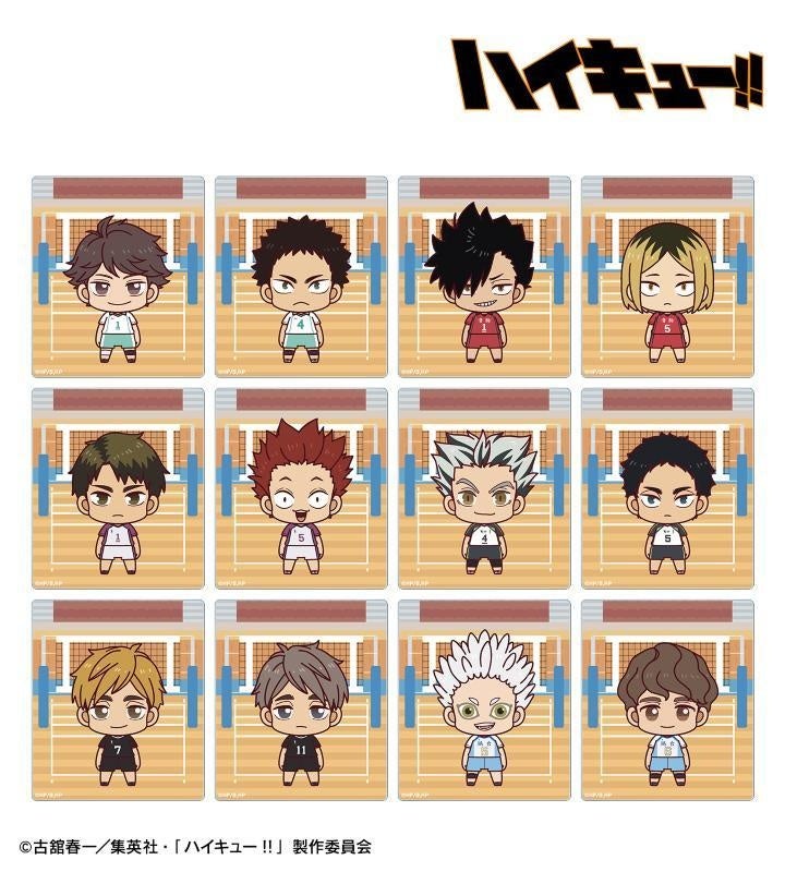 及川 徹、岩泉 一、黒尾鉄朗、孤爪研磨、牛島若利、天童 覚、木兎光太郎、赤葦京治、宮 侑、宮 治、星海光来、昼神幸郎がちょこんと立っているちびキャラを新たに描き起こし、アクリルカードに仕上げました。