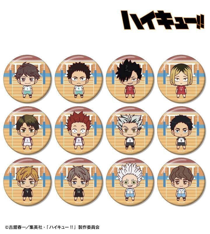及川 徹、岩泉 一、黒尾鉄朗、孤爪研磨、牛島若利、天童 覚、木兎光太郎、赤葦京治、宮 侑、宮 治、星海光来、昼神幸郎がちょこんと立っているちびキャラを新たに描き起こし、缶バッジに仕上げました。