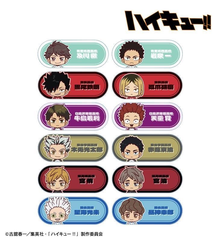及川 徹、岩泉 一、黒尾鉄朗、孤爪研磨、牛島若利、天童 覚、木兎光太郎、赤葦京治、宮 侑、宮 治、星海光来、昼神幸郎がちょこんと立っているちびキャラを新たに描き起こし、アクリルネームプレートに仕上げました。