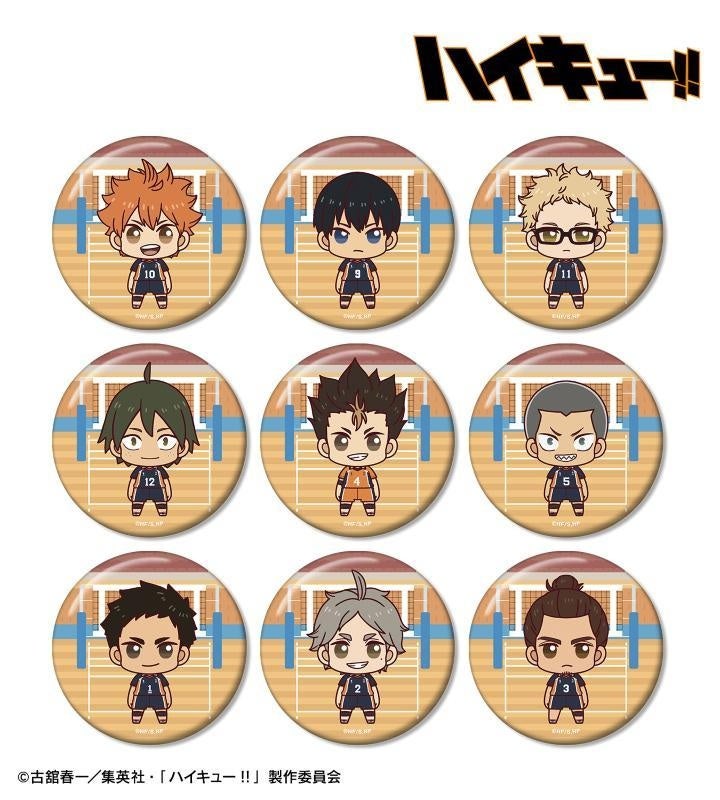 日向翔陽、影山飛雄、月島 蛍、山口 忠、西谷 夕、田中龍之介、澤村大地、菅原孝支、東峰 旭がちょこんと立っているちびキャラを新たに描き起こし、缶バッジに仕上げました。