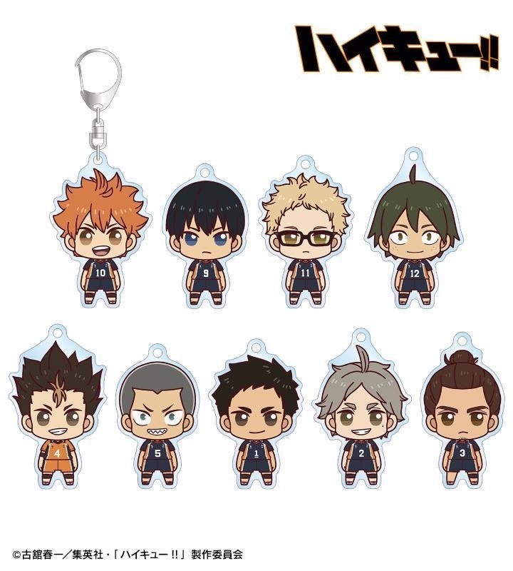 日向翔陽、影山飛雄、月島 蛍、山口 忠、西谷 夕、田中龍之介、澤村大地、菅原孝支、東峰 旭がちょこんと立っているちびキャラを新たに描き起こし、アクリルキーホルダーに仕上げました。