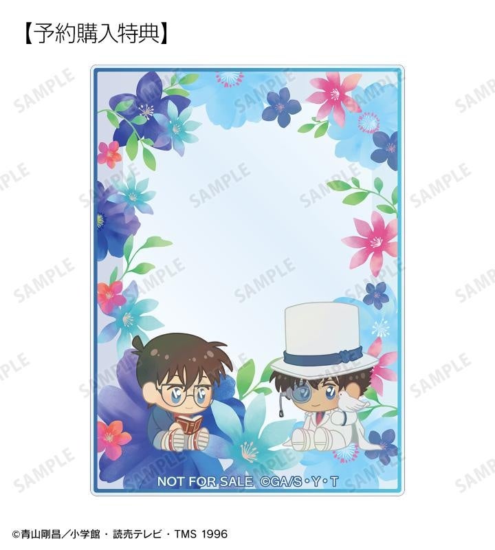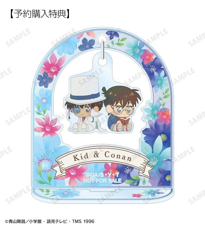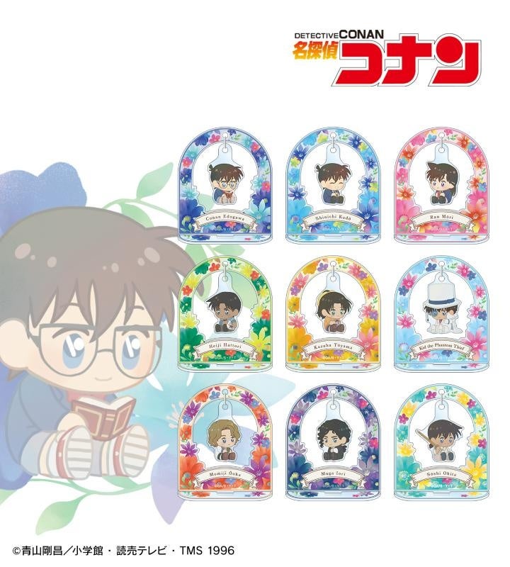 江戸川コナン、工藤新一、毛利蘭、服部平次、遠山和葉、怪盗キッド、大岡紅葉、伊織無我、沖田総司のイラストをボタニカルデザインに落とし込んで繊細なタッチで新たに描き起こし、ゆらゆら動くアクリルスタンドに仕上げました。