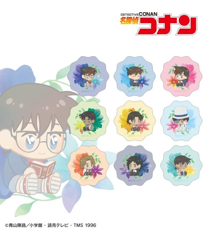 江戸川コナン、工藤新一、毛利蘭、服部平次、遠山和葉、怪盗キッド、大岡紅葉、伊織無我、沖田総司のイラストをボタニカルデザインに落とし込んで繊細なタッチで新たに描き起こし、フレークシールに仕上げました。
