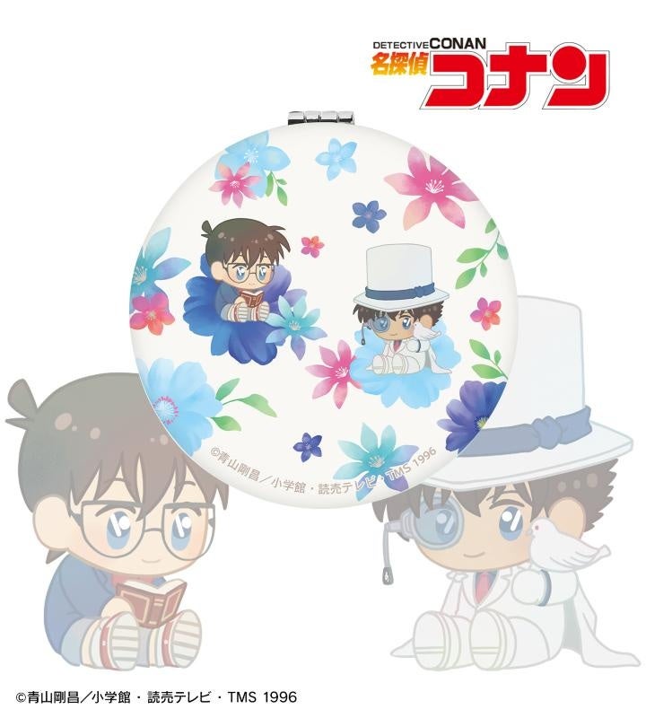 江戸川コナン、怪盗キッド、工藤新一、毛利蘭、服部平次、遠山和葉のイラストをボタニカルデザインに落とし込んで繊細なタッチで新たに描き起こし、折りたたみミラーに仕上げました。