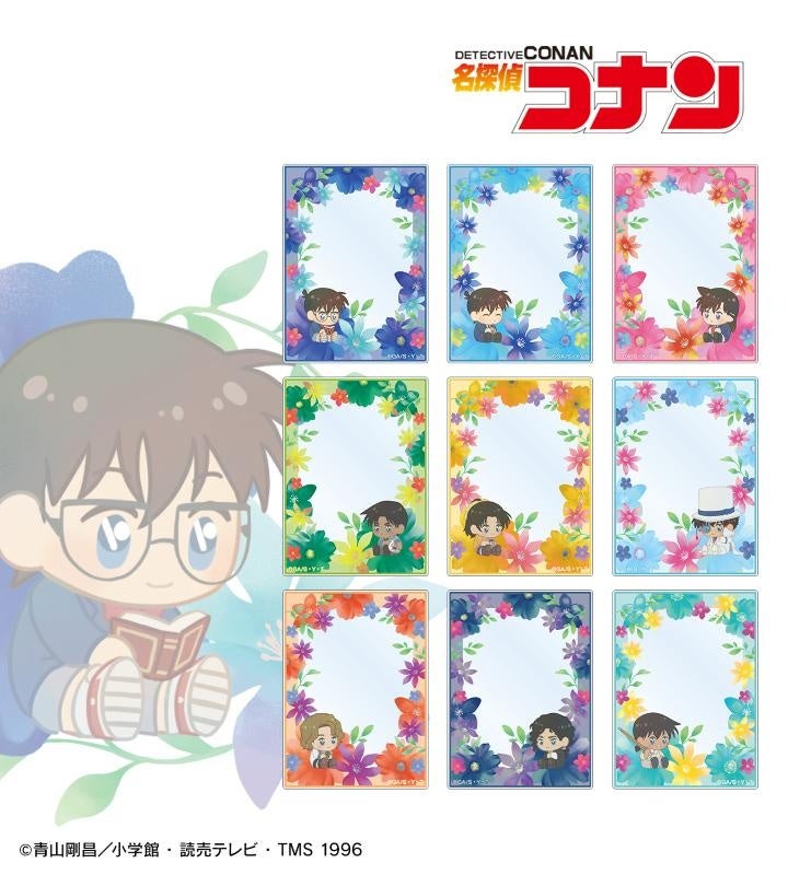 江戸川コナン、工藤新一、毛利蘭、服部平次、遠山和葉、怪盗キッド、大岡紅葉、伊織無我、沖田総司のイラストをボタニカルデザインに落とし込んで繊細なタッチで新たに描き起こし、アクリルカードに仕上げました。