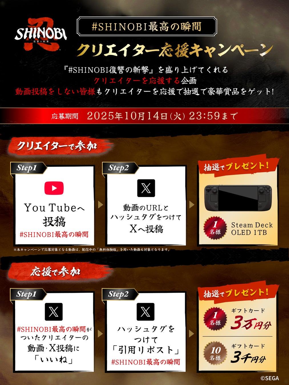 現在、『SHINOBI 復讐の斬撃』の参加型企画「#SHINOBI最高の瞬間」クリエイター応援キャンペーンを開催中です。本キャンペーンでは、YouTubeに本作の“最高の瞬間”を投稿していただいたクリエイターの方や、その動画を応援してくださる方を対象に、抽選で豪華賞品をプレゼントします。