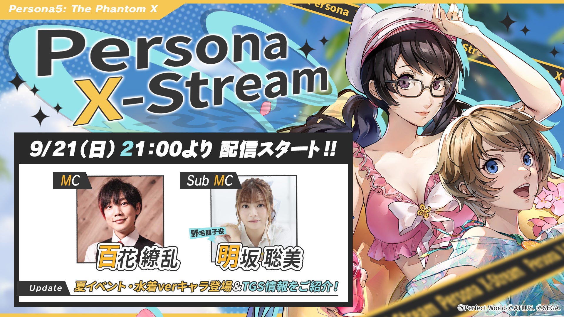 株式会社セガは、好評配信中のモバイル・PC向けゲーム『ペルソナ5: The Phantom X』(以下、『P5X』)について、2025年9月22日(月)より実装予定の夏イベント“夏だ!水着だ!SEA TIME!”や、「東京ゲームショウ2025」関連の情報をお届けする公式放送“Persona X-Stream ver. 2.1&2.2”を、9月21日(日)21:00より、アトラスの公式YouTubeチャンネル「ATLUS Tube」でプレミア公開します。