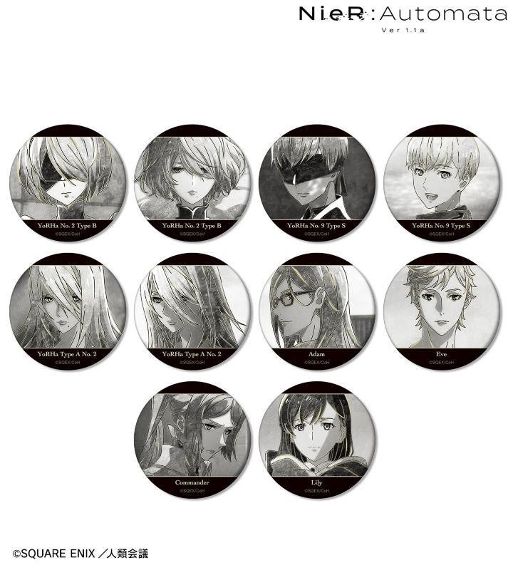 2B、9S、A2、アダム、イヴ、司令官、リリィのイラストを新たなタッチで魅力的に表現し、マットな手触りの缶バッジに仕上げました。