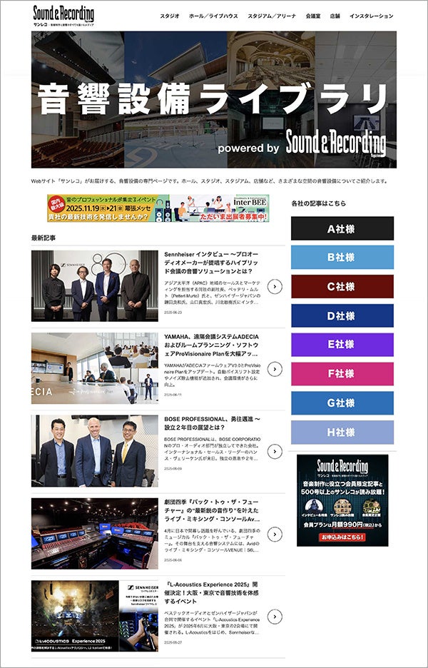 このたび、導入事例のみならず製品情報、展示会情報、メーカー紹介など、年々高まる音響設備情報を集約すべく、Webサイト「サンレコ」内に音響設備に関するポータルページ「音響設備ライブラリ」( https://www.snrec.jp/onkyosetsubi )をオープンしました。