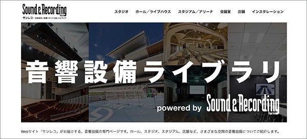 「音響設備ライブラリ」では、「サンレコ」に掲載されている音響設備関連記事(ホール/ライブハウス、公共施設/スタジアム/アリーナ、店舗、会議室、インスタレーション)などを集約。BtoBに向けたデザインで、音楽制作と音響の総合サイトである「サンレコ」とは異なる顧客層にアピールすることを目的としています。