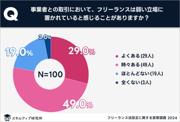 「事業者との取引において、フリーランスは弱い立場に置かれていると感じることがありますか?」という質問に対し、29%のフリーランスが「よくある」、49%のフリーランスが「時々ある」と回答した。