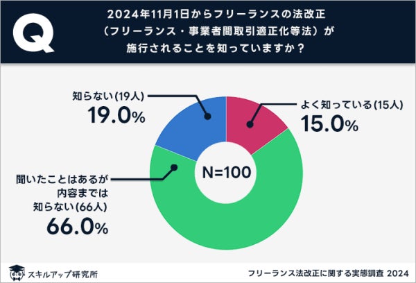 フリーランス100人に対して「2024年11月1日からフリーランスの法改正(フリーランス・事業者間取引適正化等法)が施行されることを知っていますか?」という質問をすると、「よく知っている」と回答した人はわずか15%で、85%が法改正の内容を知らないことが分かった。