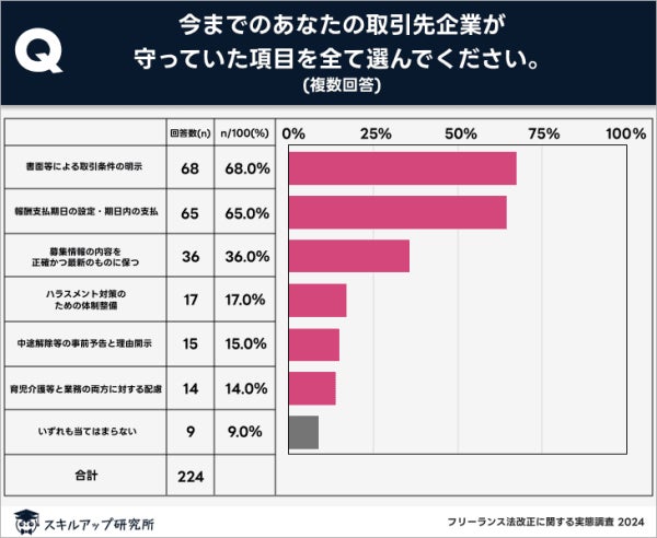フリーランス100人に法改正により企業が遵守すべき義務項目のうち、今までの取引先企業が守っていた項目について質問した。