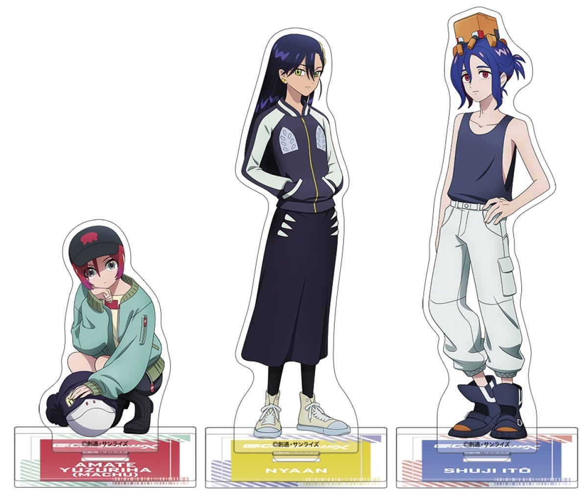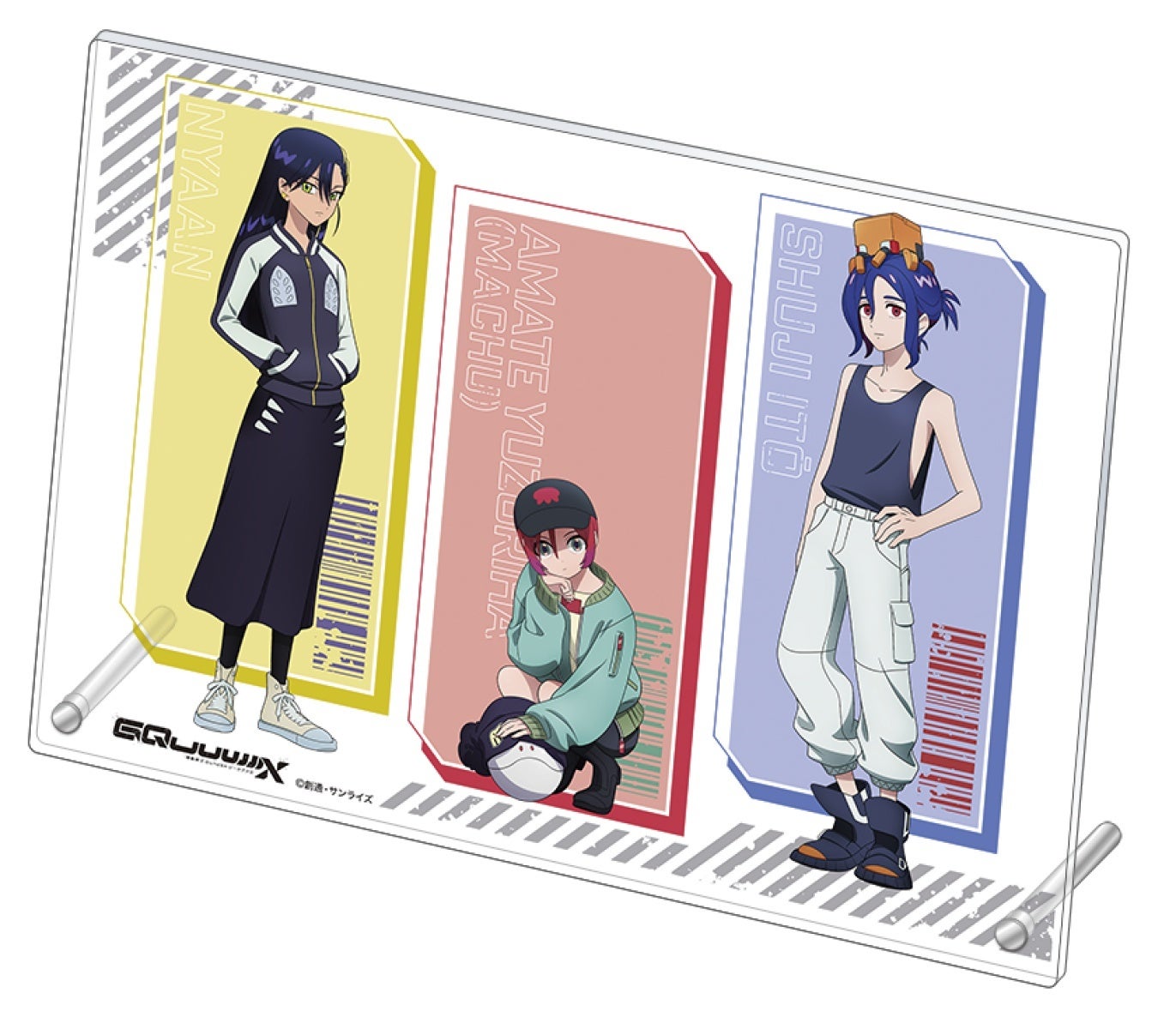 私服姿のマチュ、ニャアン、シュウジの新規描き下ろしイラストを使用した商品を発売! 定番の「アクリルスタンド」はもちろん、今話題のグッズ「証明写真館」や3人の姿が一緒に見られる「アクリルアートパネル」など多数のアイテムをラインナップしています。