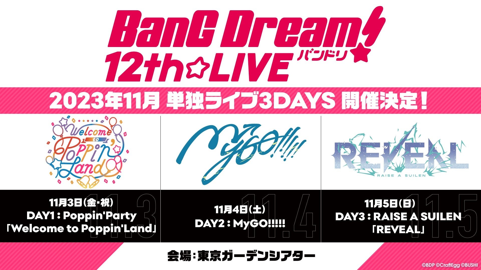 DAY1 : Poppin'Party、DAY2 : MyGO!!!!!、DAY3 : RAISE A SUILENの単独ライブ3DAYS公演となります。