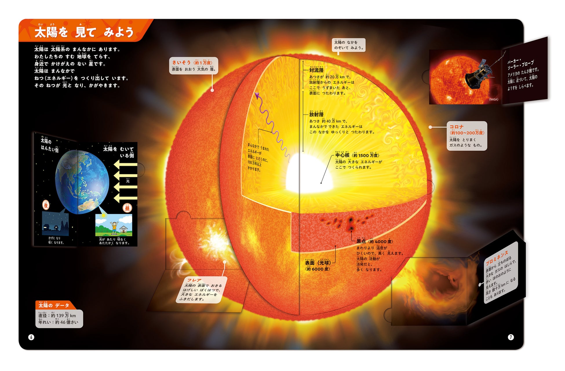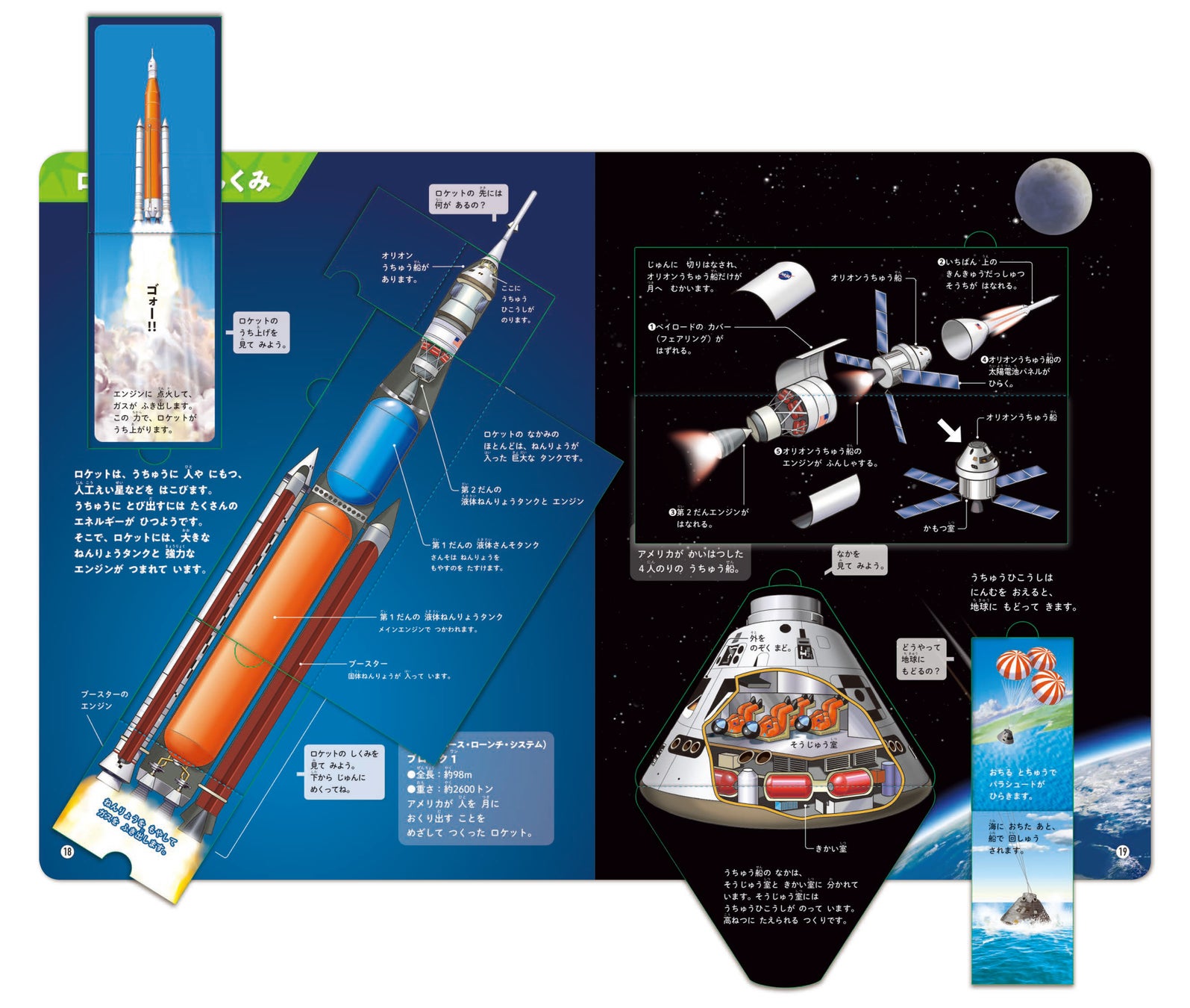 しかけをめくると、太陽や月、地球などの天体の断面が見られたり、ロケットや宇宙ステーション、宇宙服の構造が見られたり、天体と宇宙開発のしくみがわかる、しかけ図鑑です。