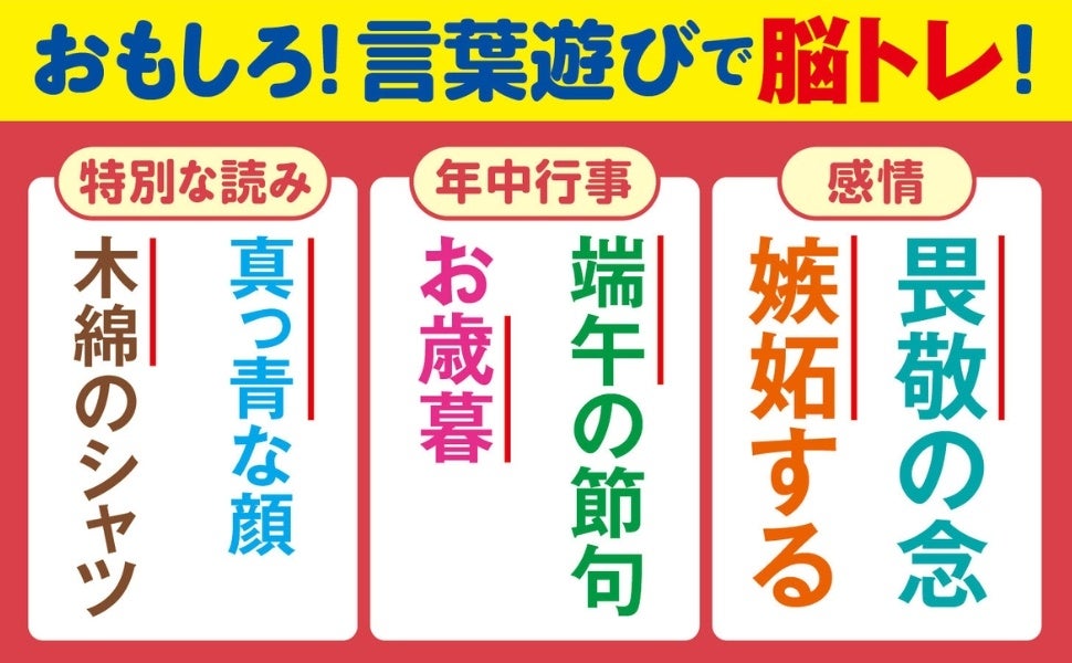 学校で習った基礎漢字やことわざ・四字熟語・故事成語・慣用句のほか、季節・地名・動物に関する常識漢字など、毎日の生活に役立つ問題ばかりです。