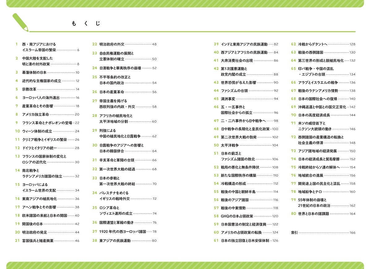 教科書の内容に沿って、全部で80テーマを収録。この1冊で、歴史総合の全範囲を学習することができます。