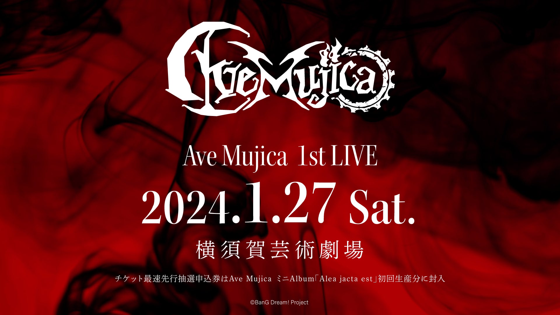 Ave Mujica 2度目の単独公演となる“1st LIVE”が、来年2024年1月27日、横須賀芸術劇場にて開催が決定しました。チケットの最速先行抽選申込券は、Ave Mujica ミニAlbum「Alea jacta est」初回生産分に封入されます。