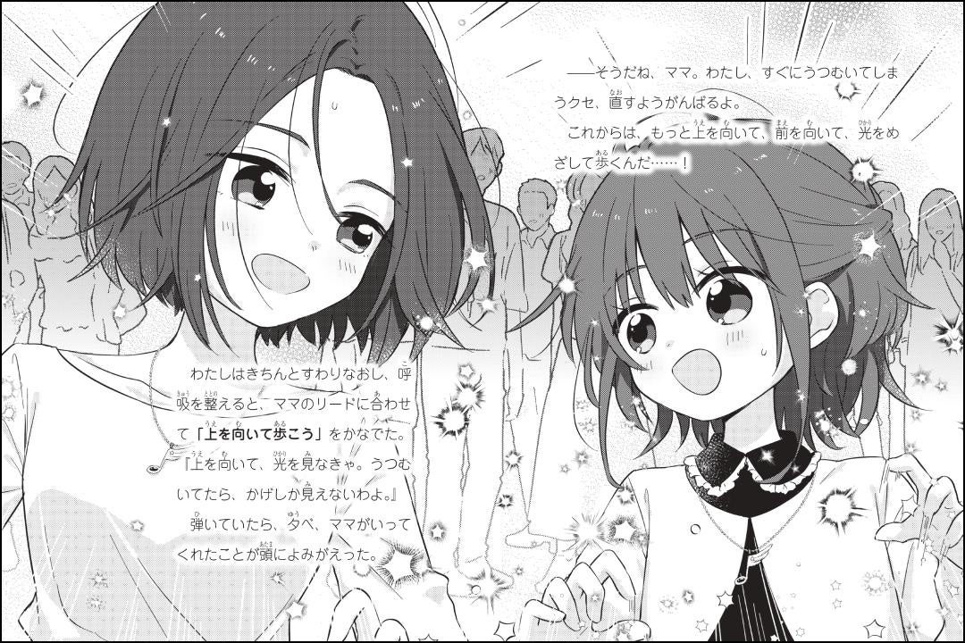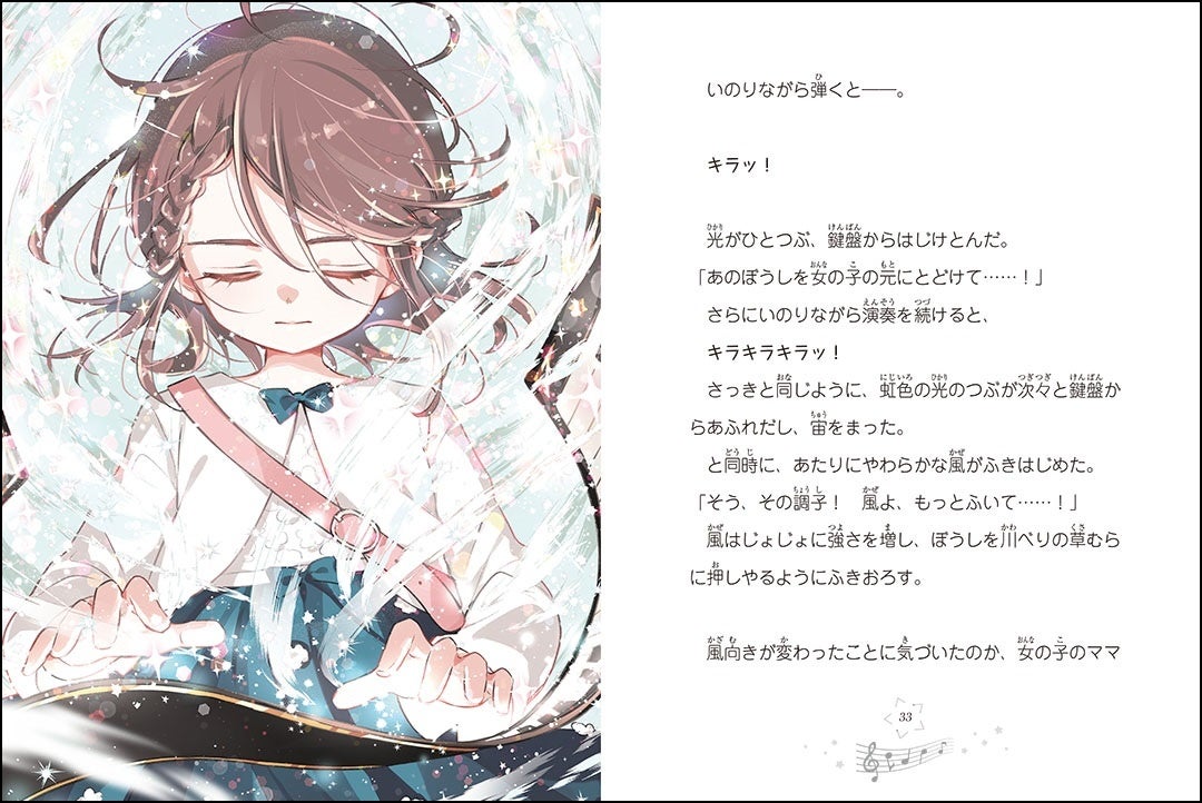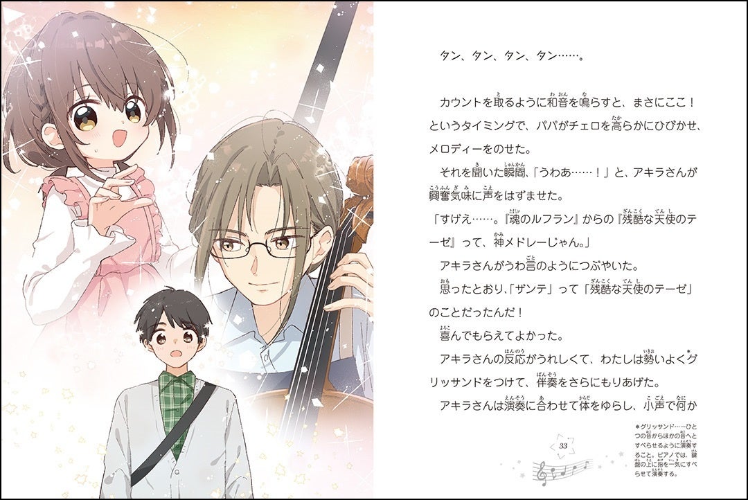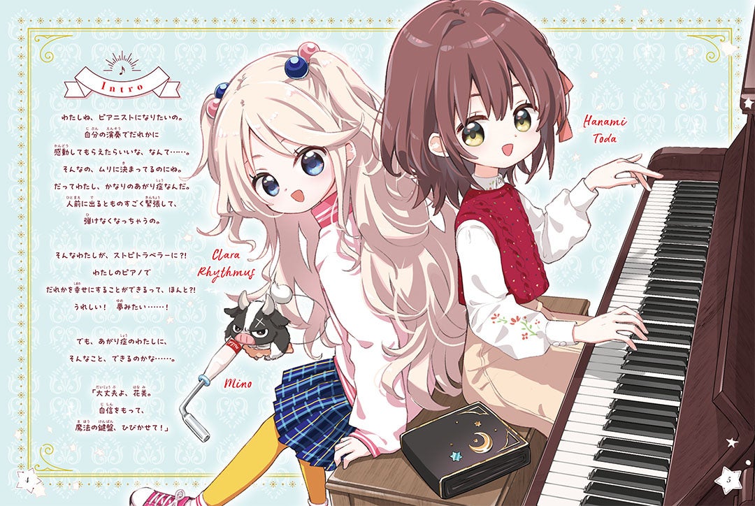 ピアノを弾くのは好きだけど、あがり症の小学生・戸田花美。異世界のクラング王国からやってきた女の子クララ。小さなウシ(⁉)の調律師・ミノ。本作では、個性的な3人がいろいろな異世界を旅して、魔法のピアノの力を使いながら、演奏で人助けをしていきます。実在するクラシックやJ-POP、アニソン、ボカロソングの名曲が登場するのも特徴です。